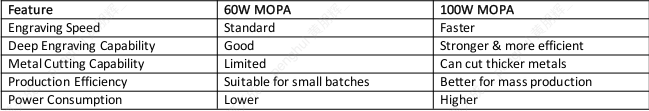 10. What is the main difference between the 60W and 100W MOPA?