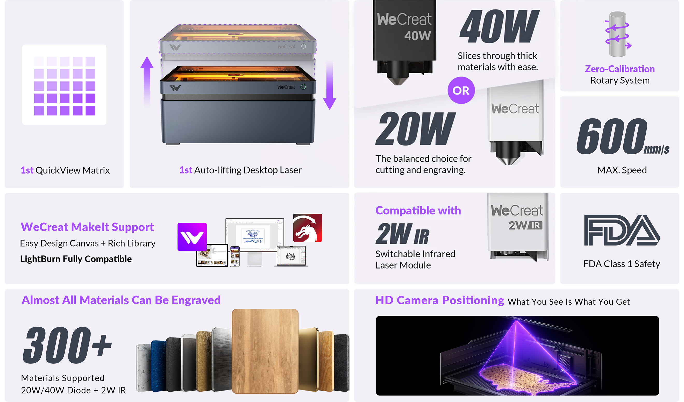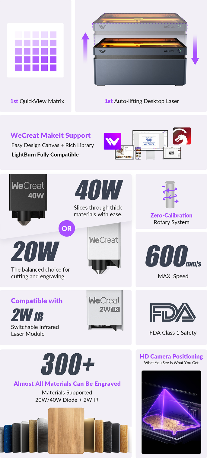 The Wecreat Vision is versatile! Both the 20W and 40W diode laser modules can cut through paper, wood, leather, MDF, felt, and dark opaque acrylic. They can engrave on an even broader range, including bamboo, fabric, dark glass, and various metals. The 2W IR laser module specializes in engraving on metal, plastic, and black acrylic, and can cut black plastic up to 1.5mm thick.