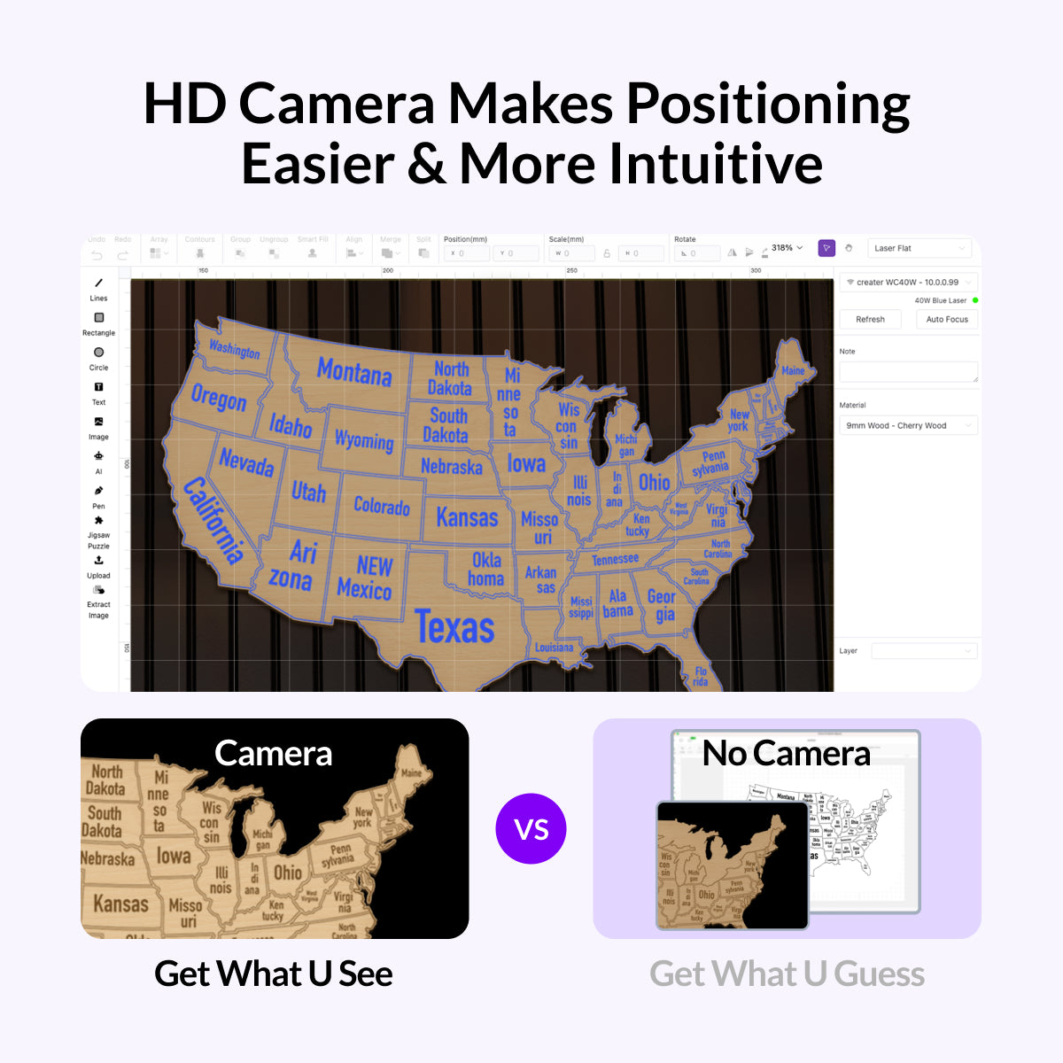 The built-in HD camera ensures your designs are perfectly positioned. Now what you see is what you get, maximizing efficient space use and minimizing material waste every time.