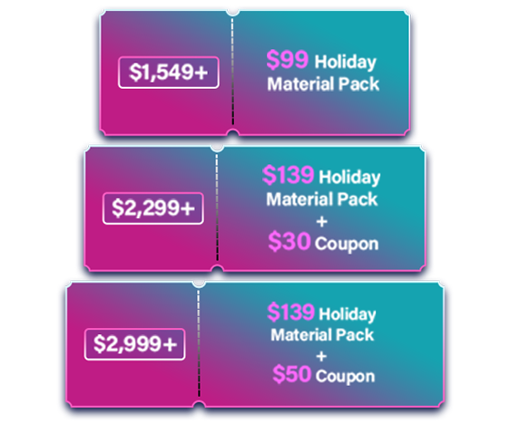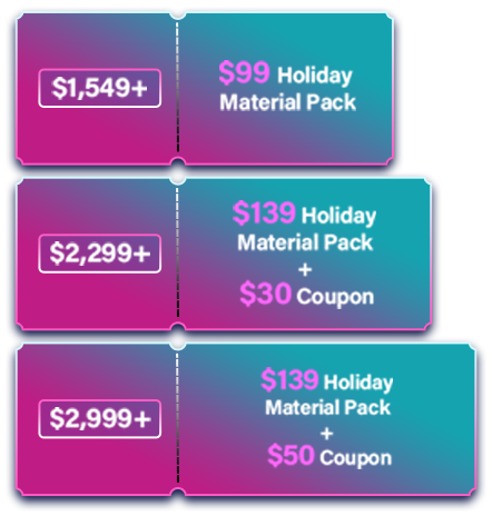 Orders over $2,999: You will receive two free Material Packs plus a $50 Accessory Coupon.