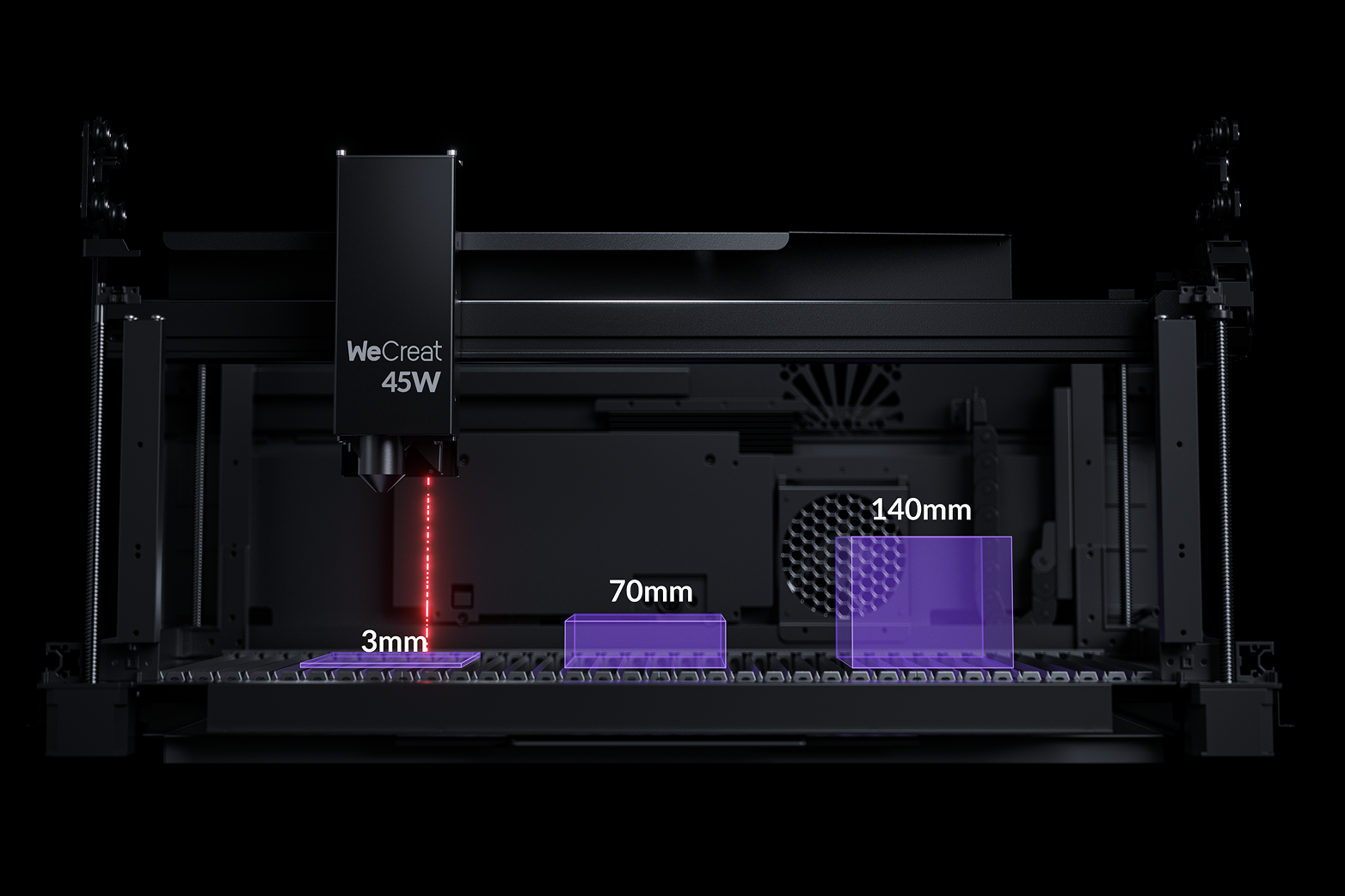 WeCreat's innovative AUTO-LIFTING system eliminates manual height adjustments. One click, and the laser head automatically adjusts for materials 1mm to 140mm thick. No risers, no hassle. Just place your material, press a button, and watch it work.