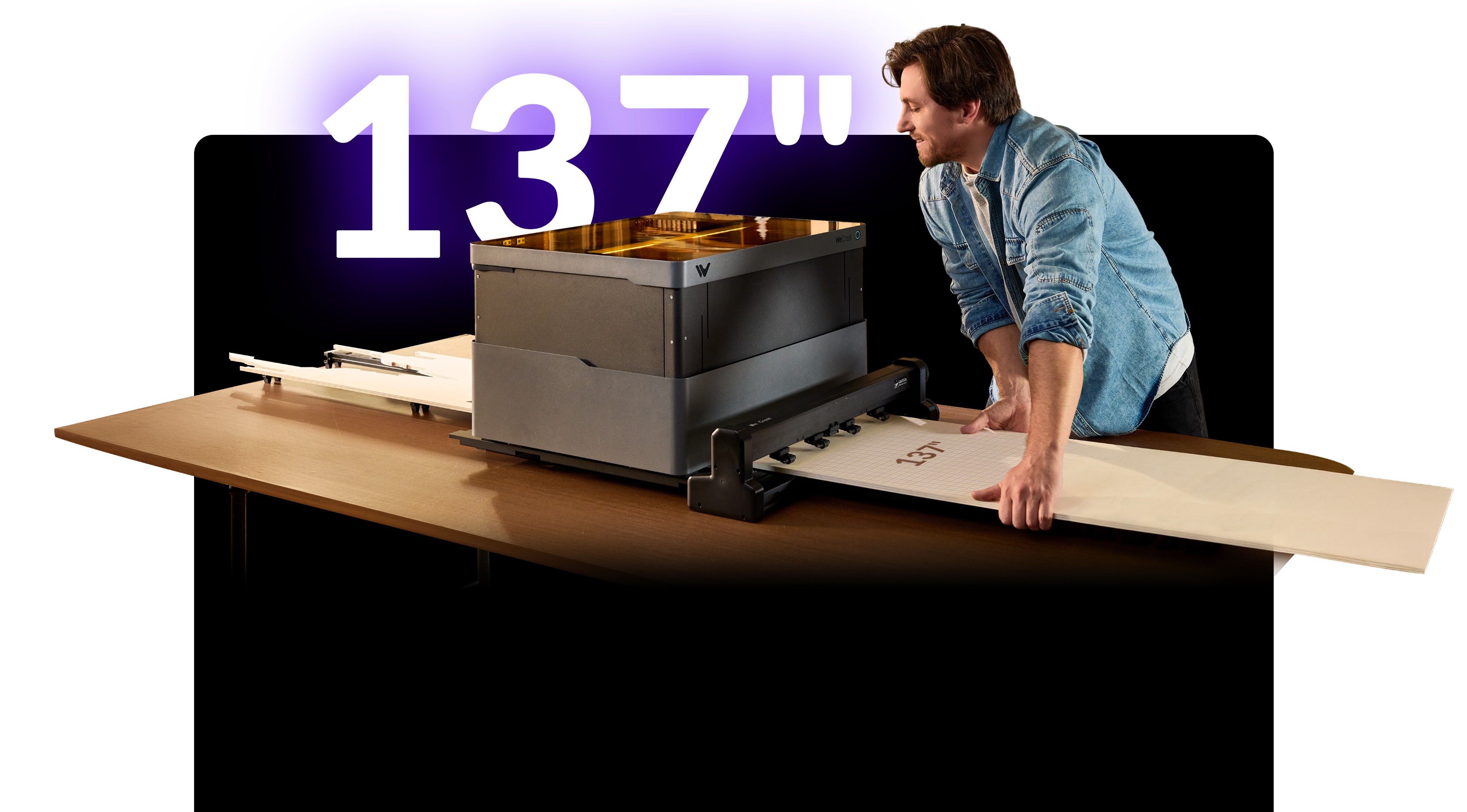 Versatility: A large working area and 137-inch auto pass-through feeder handle big projects. Plus, the Rotary Pro is the easiest-to-use rotary system, and you can easily switch to the 2W IR laser head for metal and plastic engraving, supporting 300+ materials.