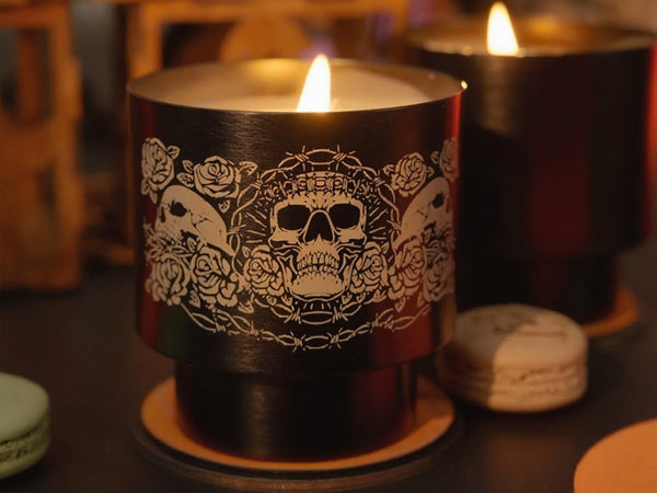 Lumos can engrave: A wide range of thin materials — including metal like stainless steel, aluminum, and plated metal — as well as wood, leather, acrylic, MDF, paper, cardboard, felt, fabric, rubber, glass, ceramic, bamboo, cork, jade, marble, shale, cement, and brick.
