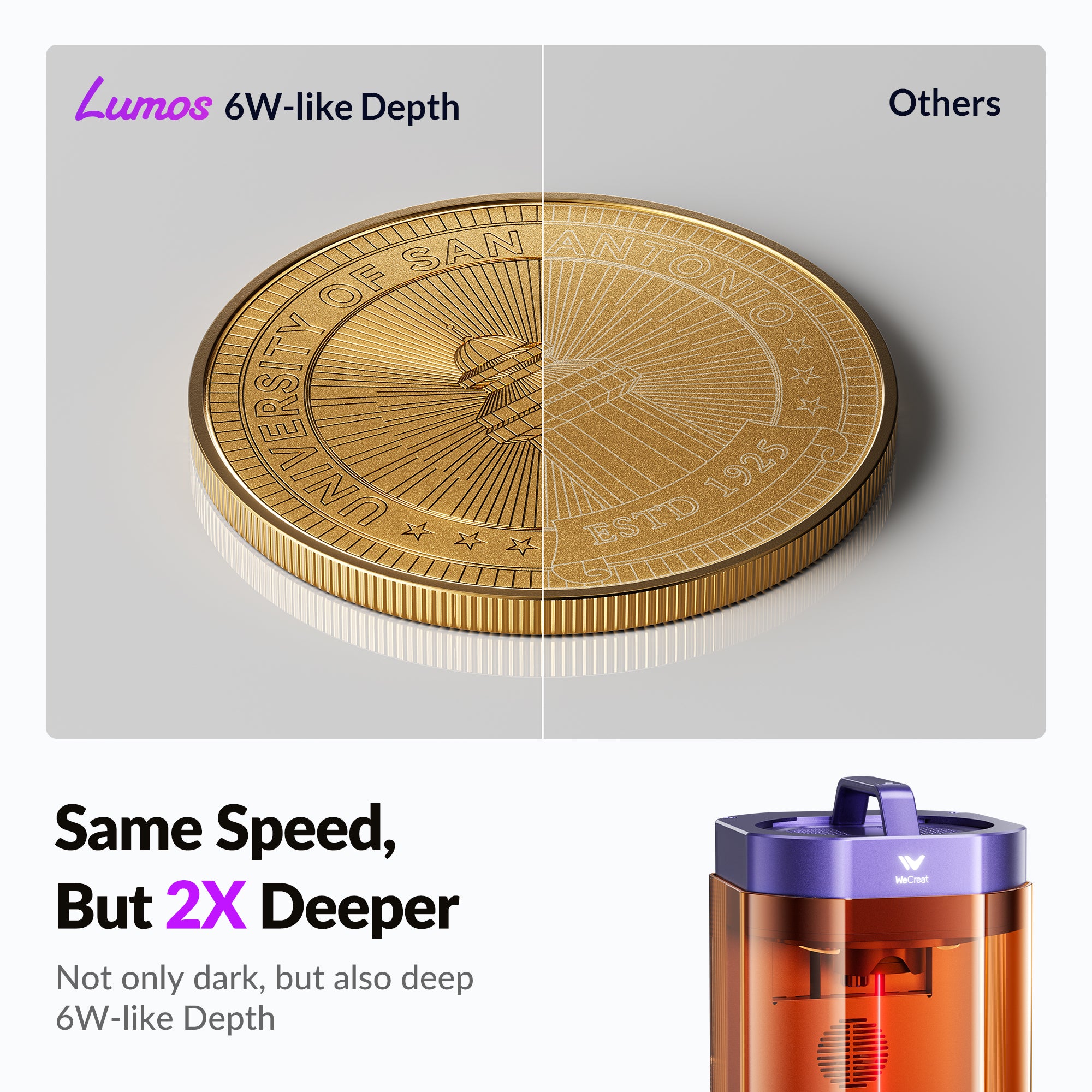 - Engrave 2× Deeper, 6W-Level depth, with Tactile Details, Beyond Black Marking.