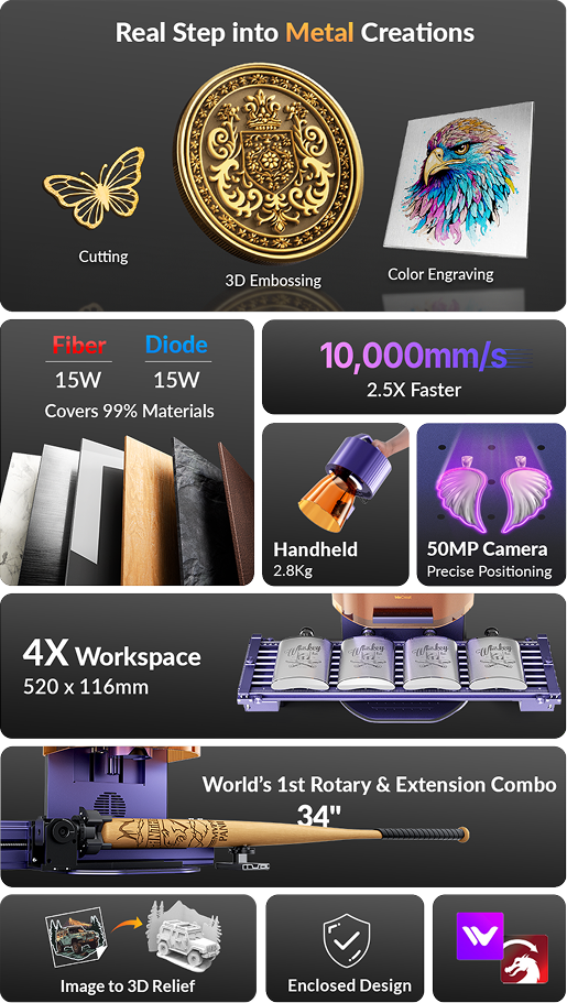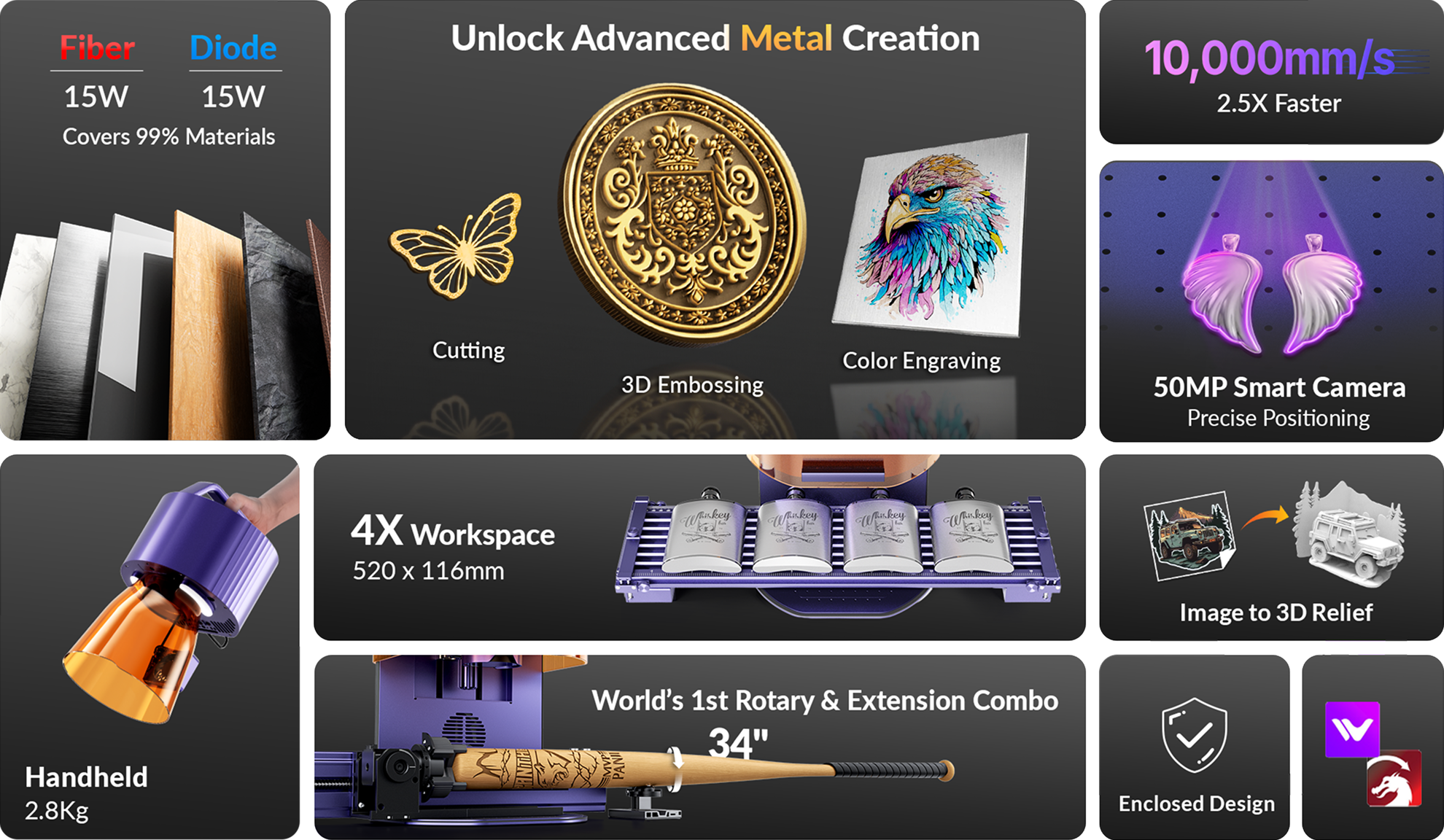 - 15W Fiber Laser – Ideal for engraving and marking on metals such as stainless steel, brass, aluminum, gold, and silver. It also supports color marking on stainless steel.
