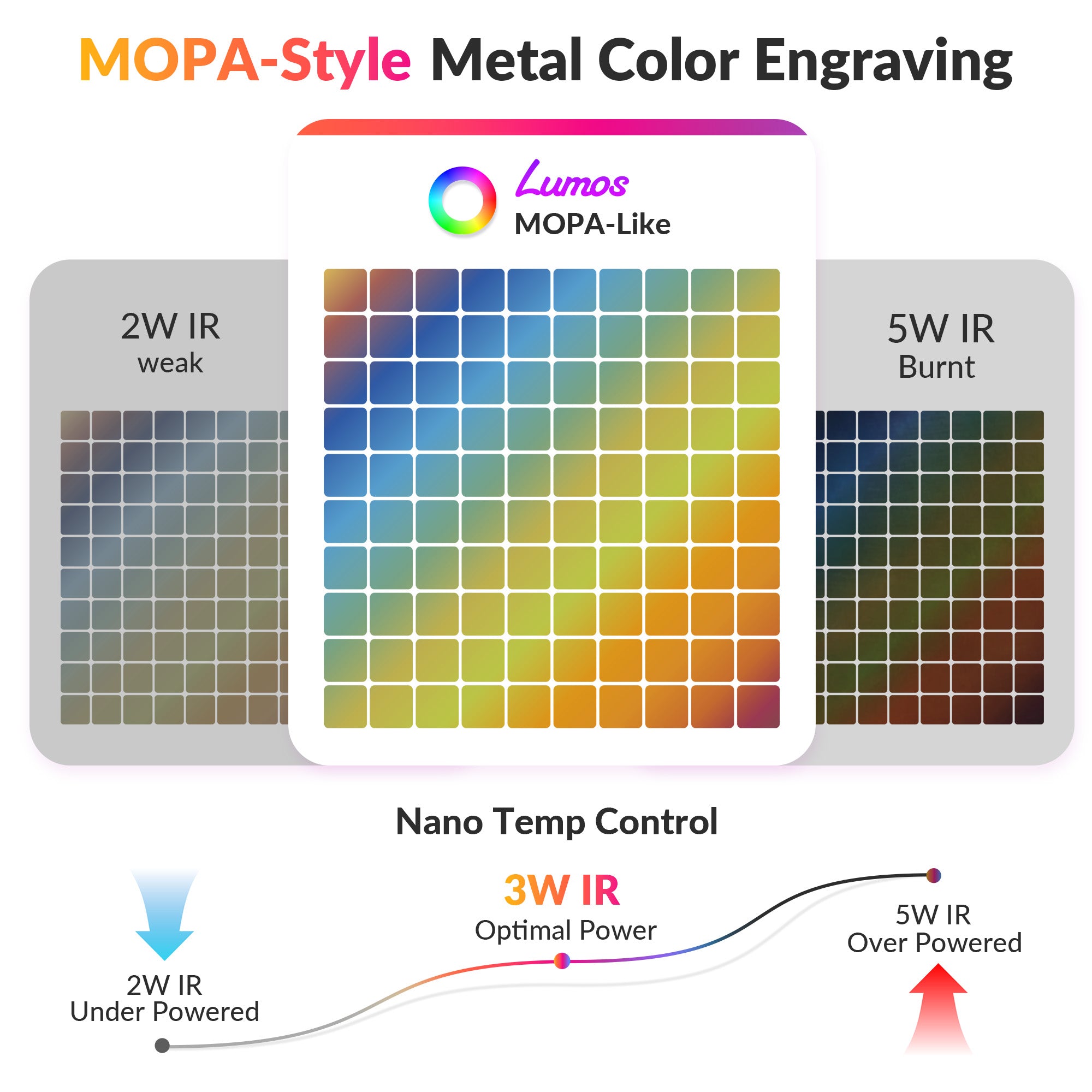 • Unlock MOPA-Style Metal Color Engraving with 3W IR Nano Temp Control.