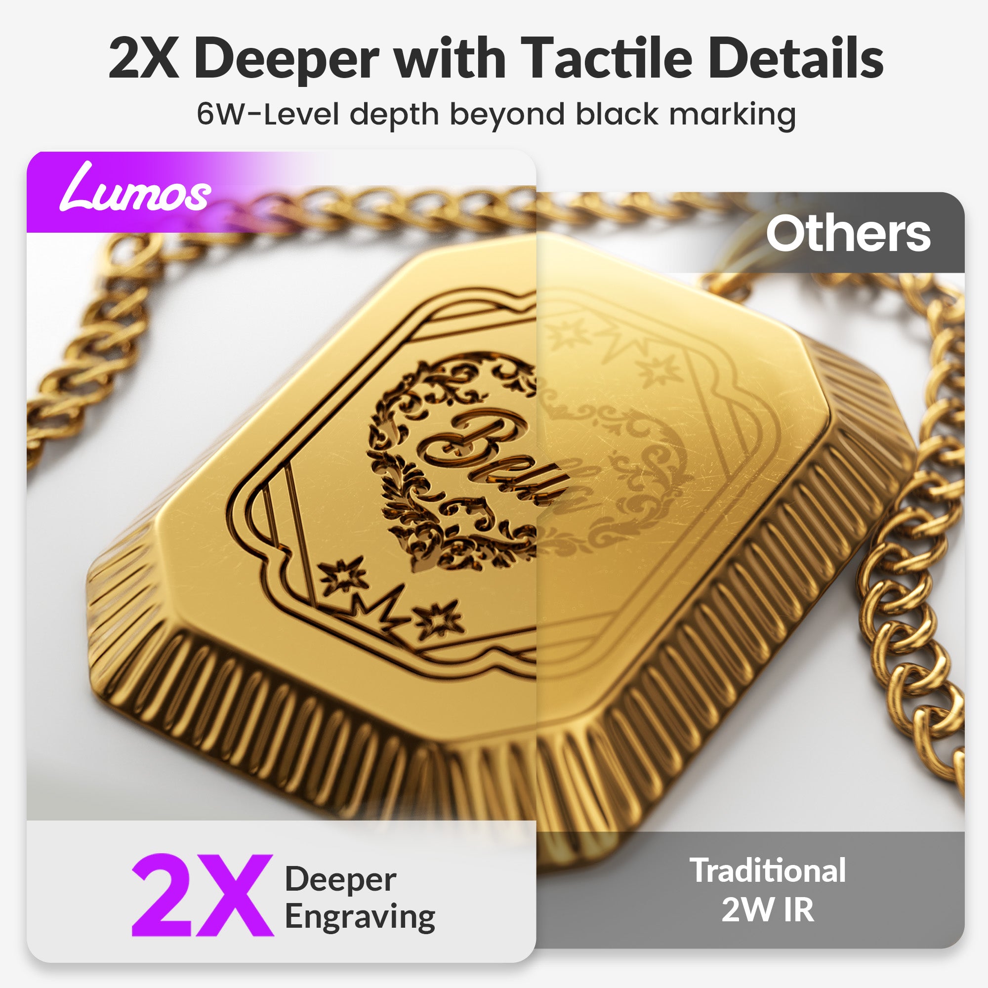 Lumos' 3W IR + BeamFocus 2.0 creates not just black marking on jewelry, but genuine grooves and ridges you can feel with your fingers. Higher contrast. Deeper marks. Better legibility.