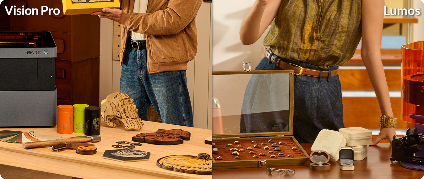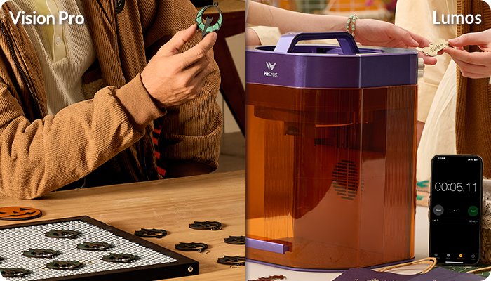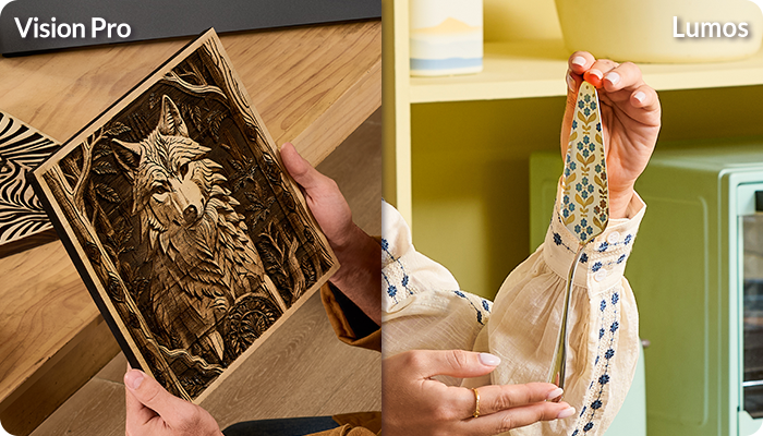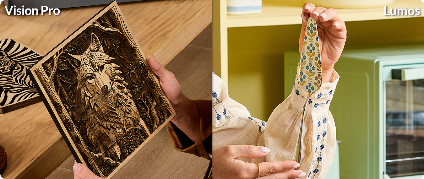Vision Pro slices through up to 25mm thick wood in a single pass, ideal for large or batch projects. Lumos engraves small custom items at 4000mm/s, boosting speed and precision.