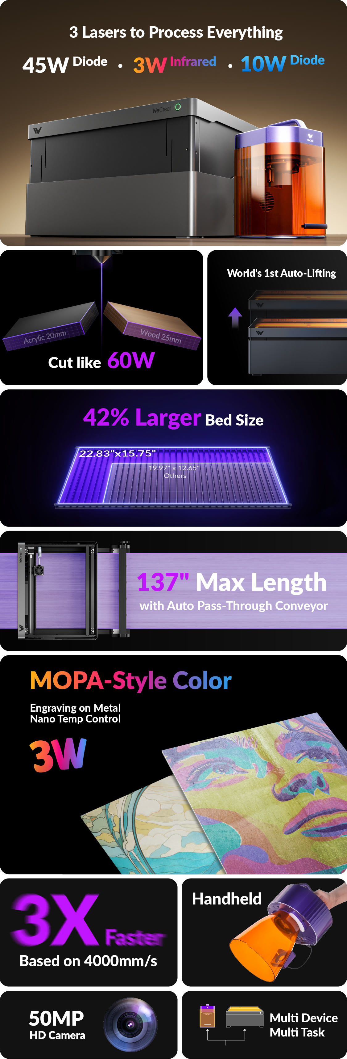 An industry first, WeCreat's Auto-Lifting Design is a tried n' true fan favorite. This ingenious system intelligently adjusts the laser head to the perfect height (0-140mm) for a seamless workflow, eliminating the hassle and cost of a riser base.
