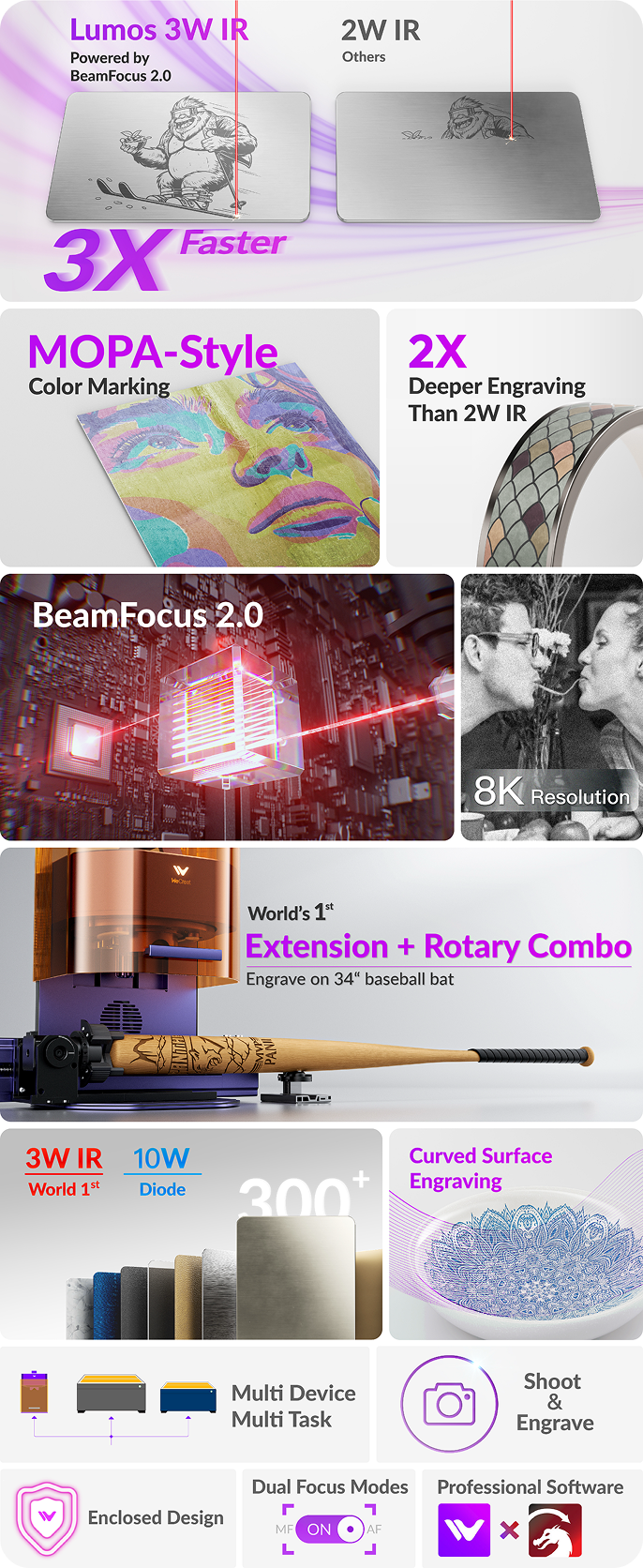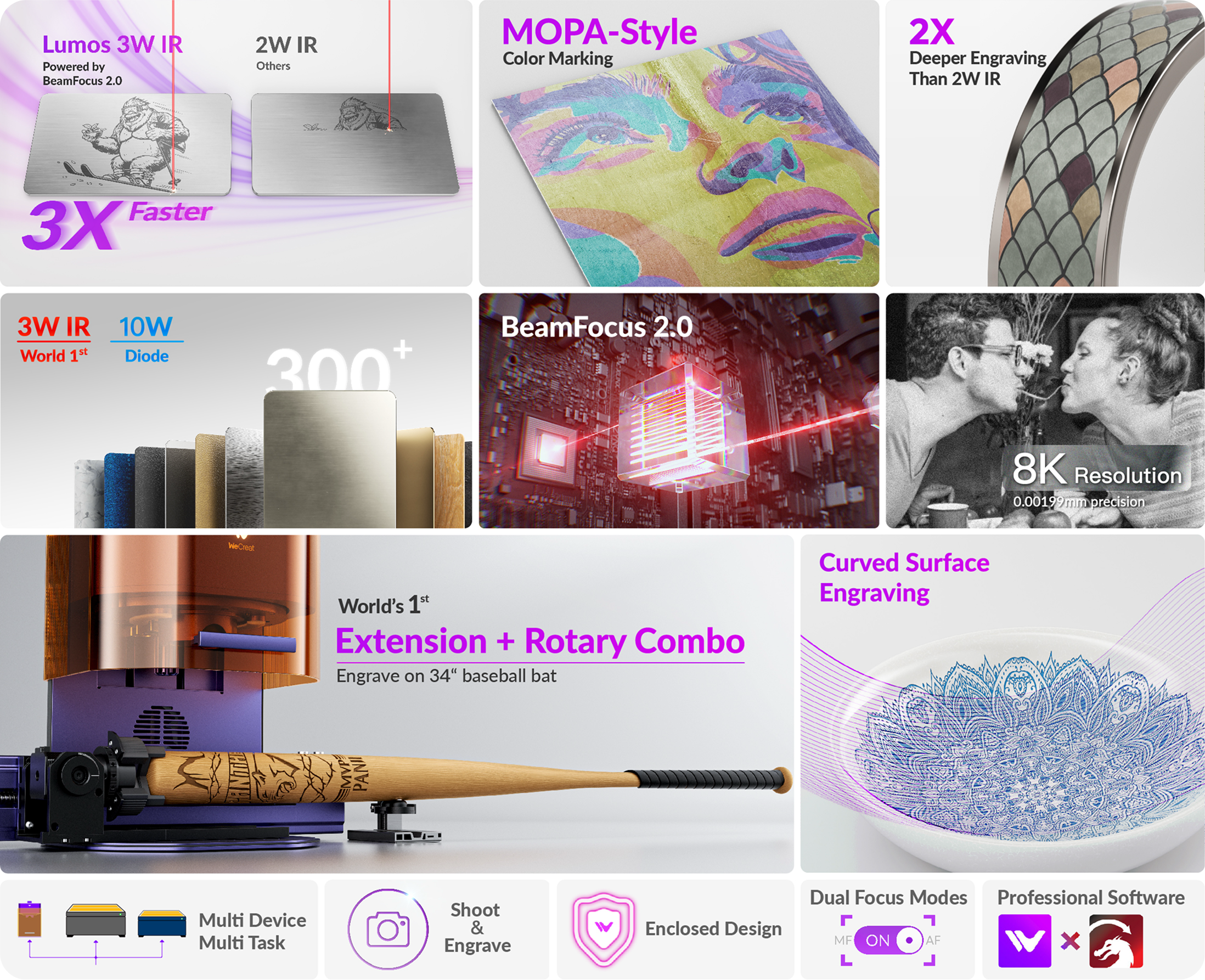 Versatility: A large working area and 137-inch auto pass-through feeder handle big projects. Plus, the Rotary Pro is the easiest-to-use rotary system, and you can easily switch to the 2W IR laser head for metal and plastic engraving, supporting 300+ materials.
