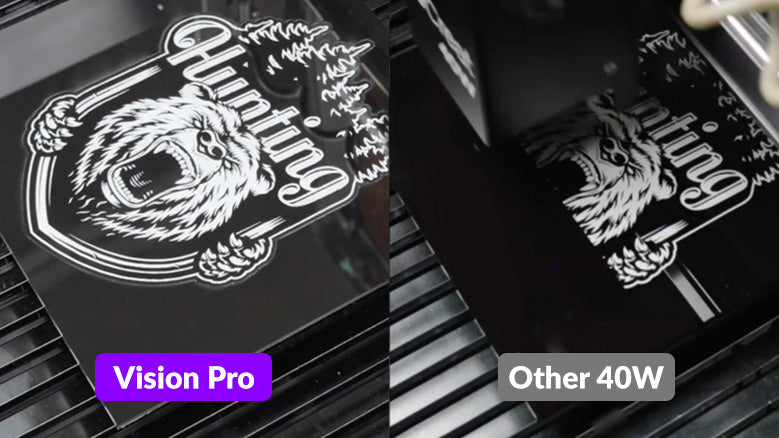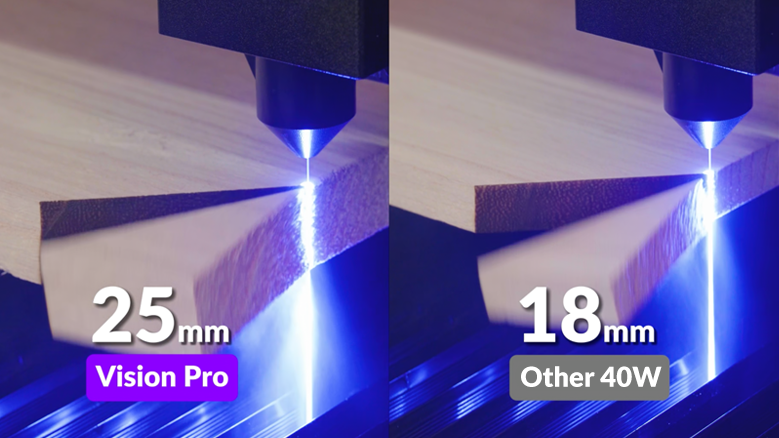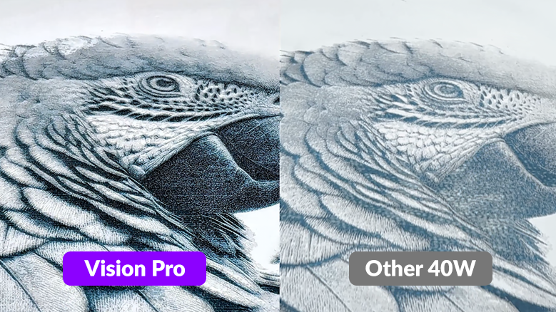 The Vision Pro features a proprietary advanced BeamFocus optical system, enabling thicker cuts, faster speeds, and more intricate details, comparable to the power of a 60W diode laser. Additionally, the Vision Pro offers a larger working area, with an even wider range available when using the Auto Pass Through Feeder.If you are a small business owner or DIY enthusiast who requires greater cutting depth, higher engraving efficiency, and a larger working area, we recommend the Vision Pro 45W.If these factors are not your top priority, and you prefer a more compact machine, the Vision 40W is a great choice.