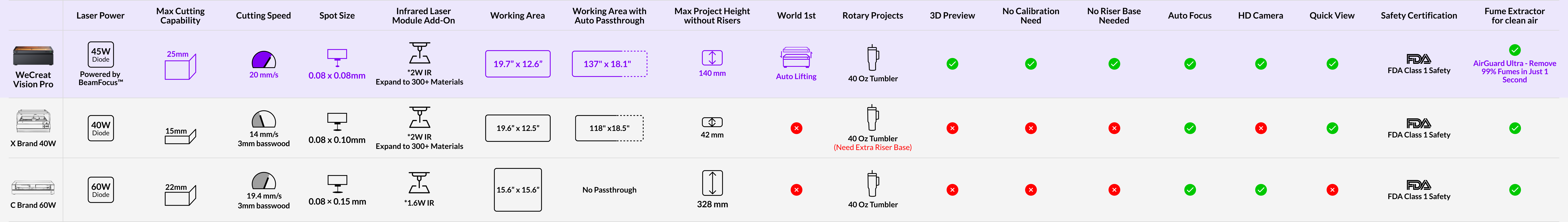 The Vision Pro features a proprietary advanced BeamFocus optical system, enabling thicker cuts, faster speeds, and more intricate details, comparable to the power of a 60W diode laser. Additionally, the Vision Pro offers a larger working area, with an even wider range available when using the Auto Pass Through Feeder.If you are a small business owner or DIY enthusiast who requires greater cutting depth, higher engraving efficiency, and a larger working area, we recommend the Vision Pro 45W.If these factors are not your top priority, and you prefer a more compact machine, the Vision 40W is a great choice.
